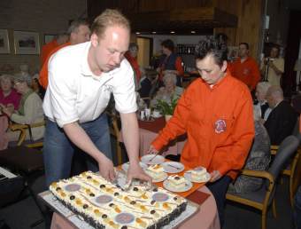 festiviteiten. De taart was hier van Bakker Lips. Muziek- en Cabaretgroep 't Ploegske vemaakte de volle zaal uitstekend. Het orkest stond onder leiding van Princenhagenaar Janus van Dijk en de 94-jarige klarinettist speelde op geweldige wijze zijn partij mee. Hij was echter niet de oudste in de zaal, want onder de bezoekers bevond zich ook de heer Van Rijckevorsel die 1 februari j.l. 100 jaar is geworden. Kortom een activiteit die niet uit Princenhage mag verdwijnen.