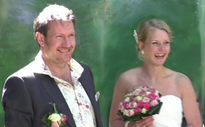 | Vrijdag 16 mei, 13:15 uur kwam letterlijk de huwelijksboot met meester Frido Schrauwen en zijn Marjo Melis met een happening op de Haagsemarkt. Frido, wat doet hij allemaal niet kun je beter zeggen, dan ben je vlug klaar. Schoolmeester, organisator, bouwer, muziekmaker, sfeermaker, beheerder... Marjo, ook niet onbekend in de carnavals-scène -ze was dit jaar een van de bloedmooie hofdames van de nieuwe Baron-met-de-lange-naam van 't Ginneken- en dochter van ex-baron Koen is de gelukkige.